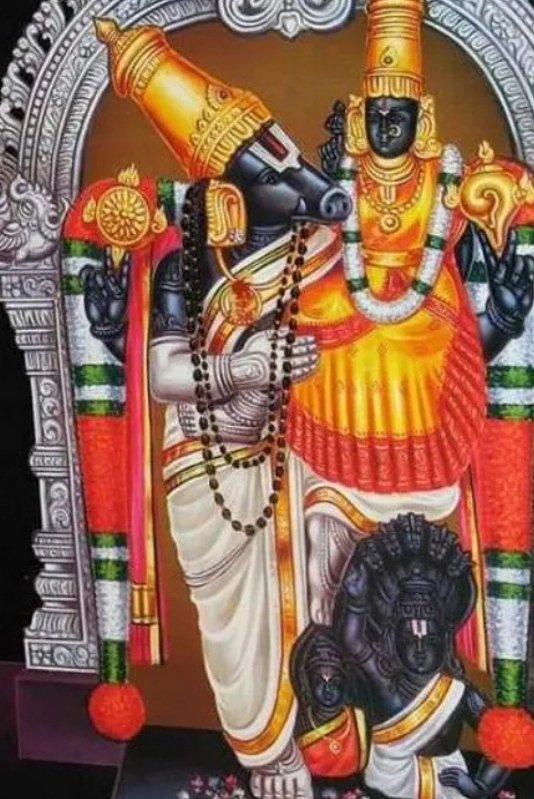 One finds the Lord in a unique standing posture facing East. While one leg is on the ground, the other is on Adhisheshan and his wife. And he is seen balancing Goddess Agila Valli on his left thigh.